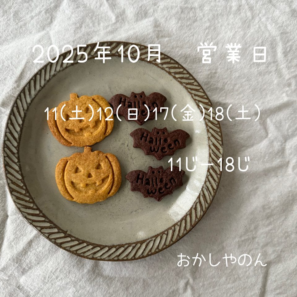 2025年10月 営業日 2025年10月3日 by okashiyanon お知らせが遅くなり申し訳ございません 10月から月1回のオープンを再開致します 10/11.12.17.18の4日間 11じー18じです すべてのおかしのご予約、お取置きを承ります 受け取り希望日2日前までにご連絡いただけますと幸いです お気軽にお立ち寄りください! お待ちしております♩