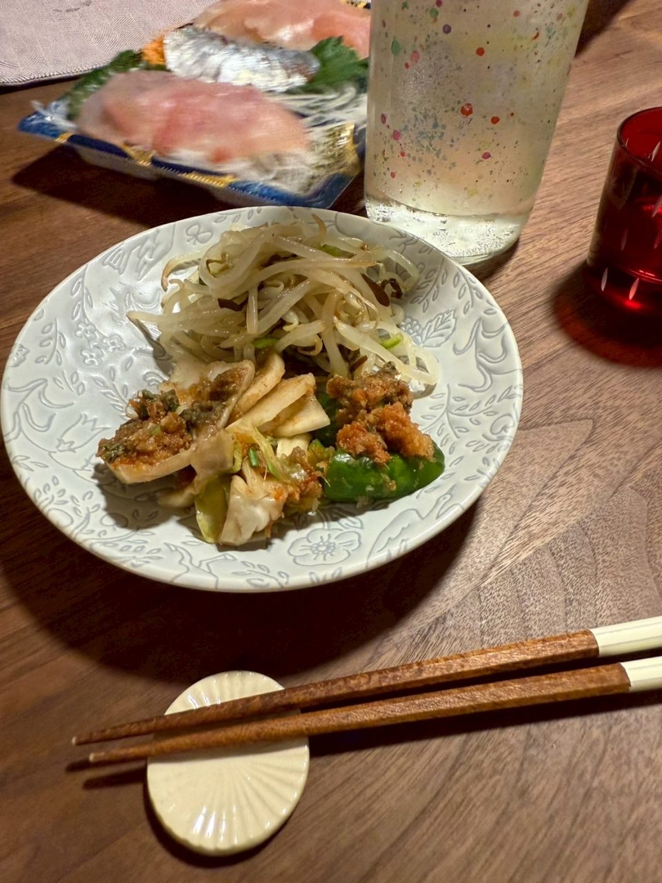 先輩から頂いた手作り発酵キムチとお刺身盛り合わせといただきました